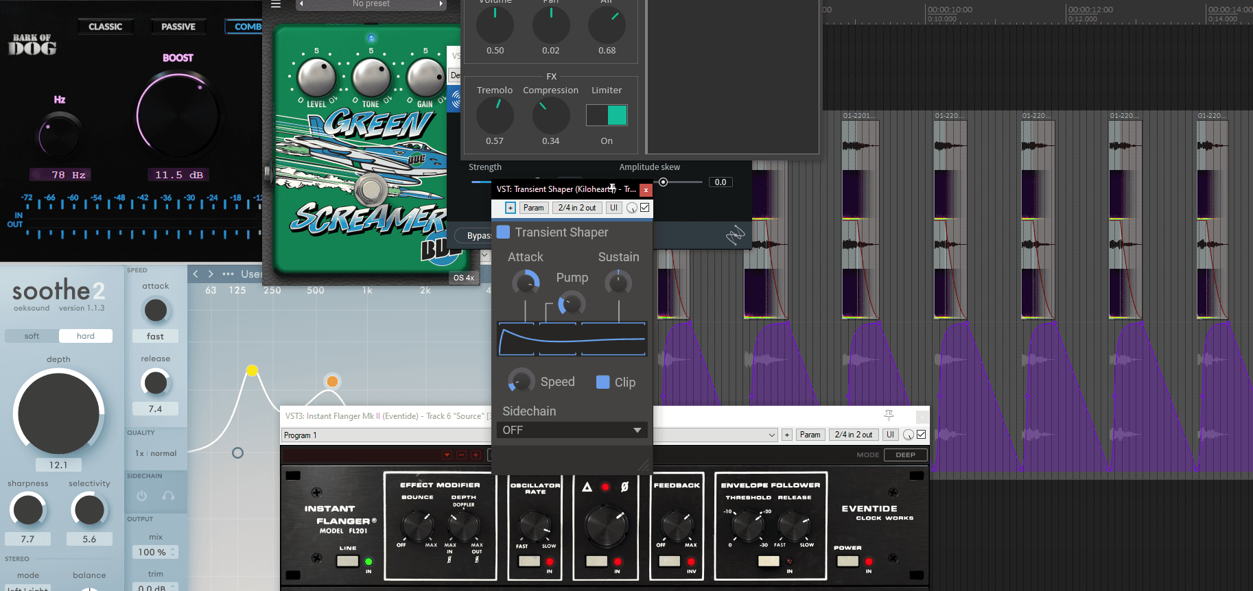 Each time I felt I had stumbled on an interesting effect chain or settings, I’d just print big sections of this source through those settings. So I ended up without about 4-5 different versions of processing. But I wanted more modulation, more interesting envelopes, and more layering. I figured Tonsturm’s Whoosh would be a good starting point for this.