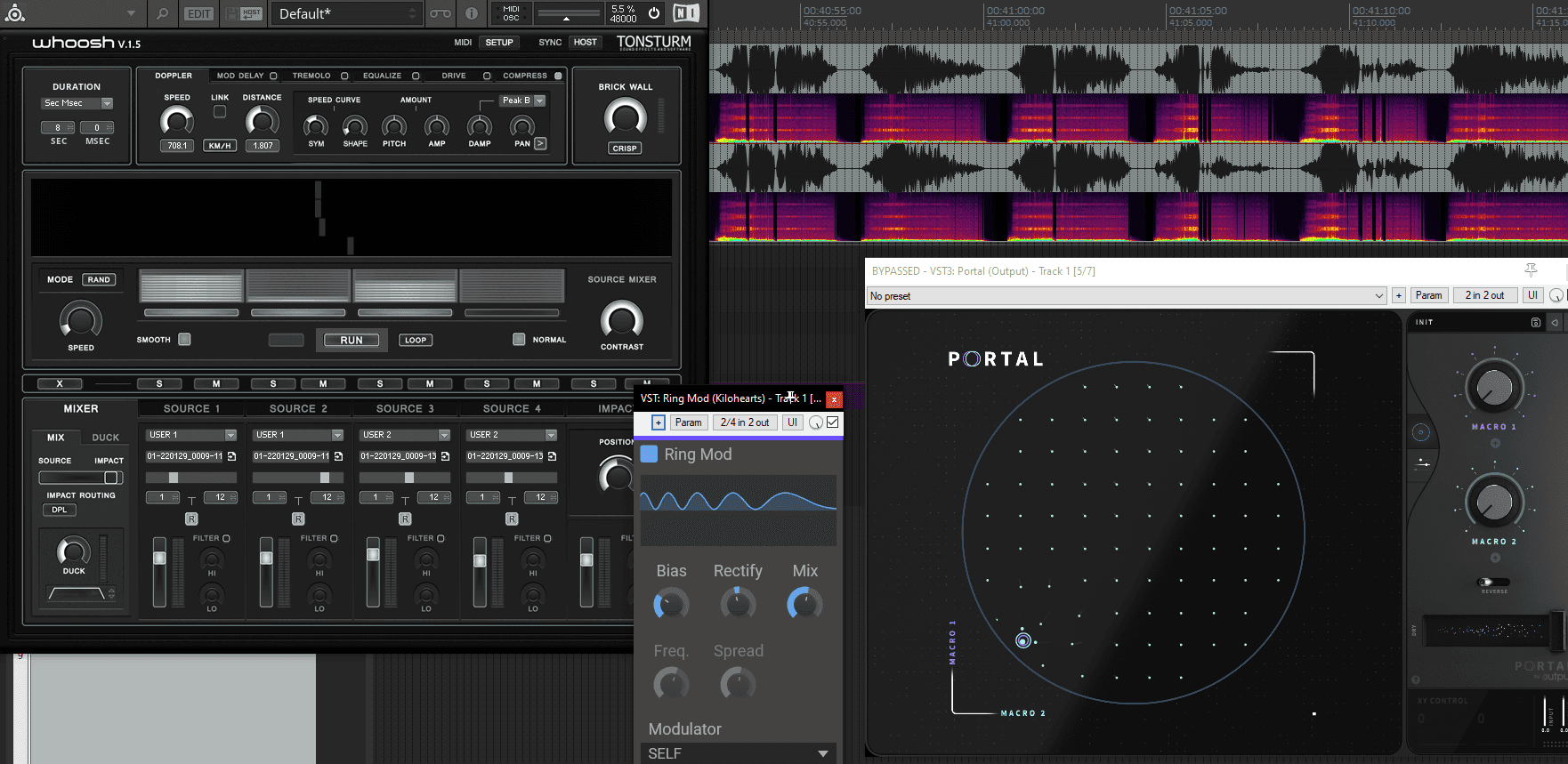 I’ve been really enjoying Output’s Portal plugin, so while Whoosh was creating further variations and randomizing the source samples, I was playing portal and adding more variation into it. I was also using Reaper’s audio modulation to drive the XY macros as well.