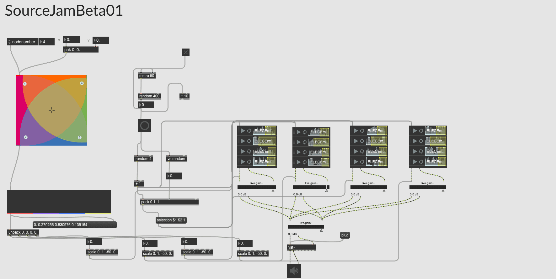 For this, I created a simple Max patch. This uses a simple XY pad to blend between 4 different regions, these regions are mapped to volume controls for 4 different banks of sounds, and then there’s randomization happening within each bank. So basically as I’m able to move my controller around, I’d be mixing and blending the sounds together in different combinations.