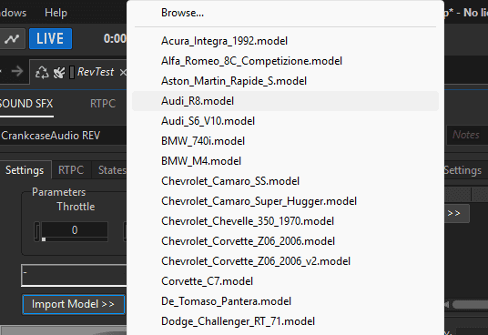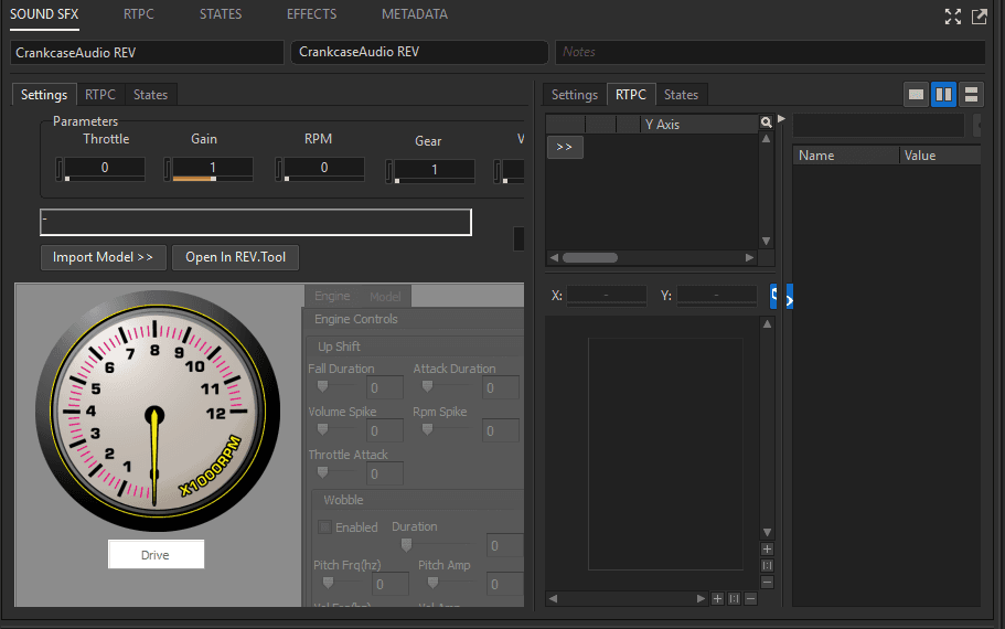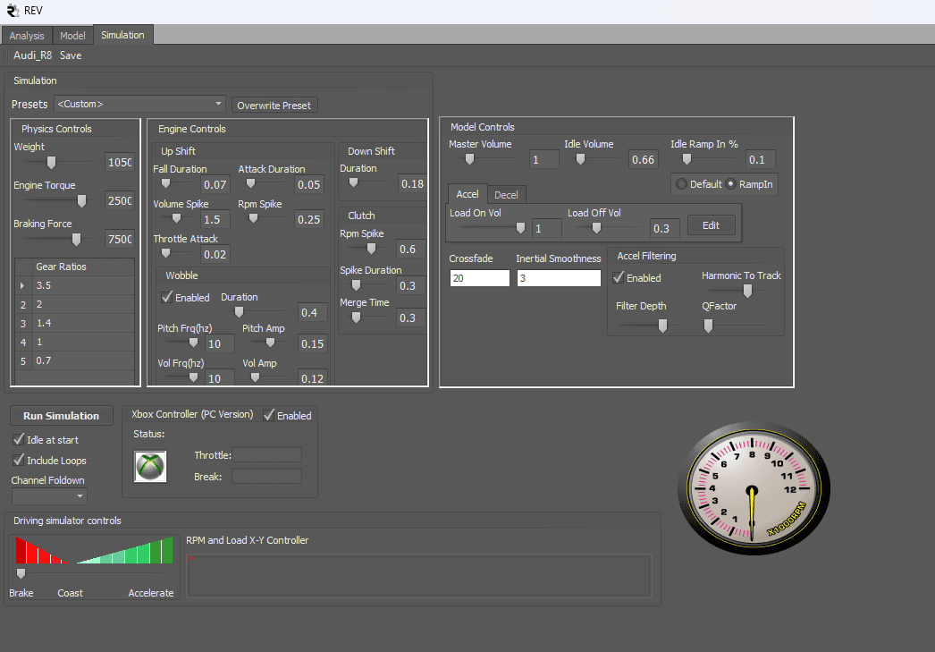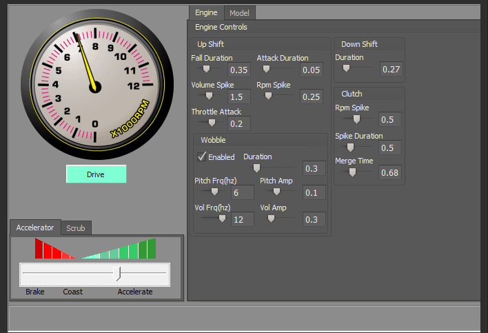 This should start the idle loop, and you should notice the “Drive” button becomes clickable. Once clicked the “Accelerator” becomes visible and you can drag the throttle value around to test the sound further.