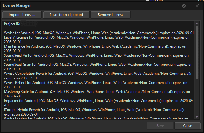 Back in Wwise, click on the Project > License Manager. Then in the dialog select “Paste from clipboard”