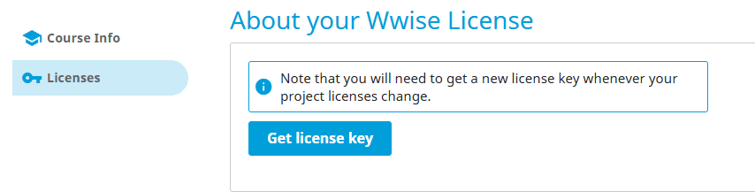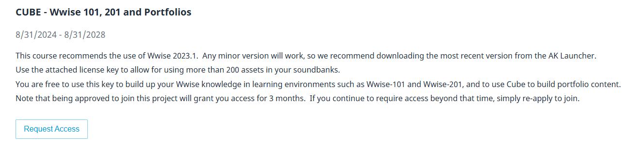Once you’ve been granted a license, if you click on your profile on the Audiokinetic page and go to “My Projects” - you should see “Wwise 101, 201, and Portfolios”- and on the left, a “Licenses” tab.
