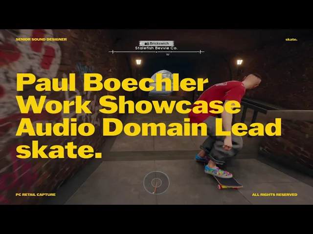 As domain lead for skateboarding, foley, and UI - during the bulk of development I was recording and creating assets. Editing, designing and creating assets for these areas. And, continuing to iterate on audio systems to ensure we had scalable systems that would hold up well to more content in live service.